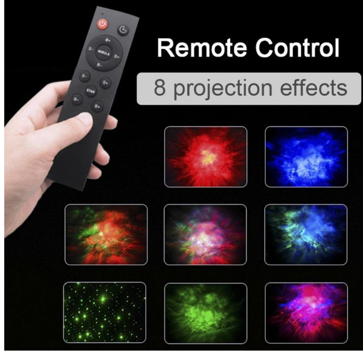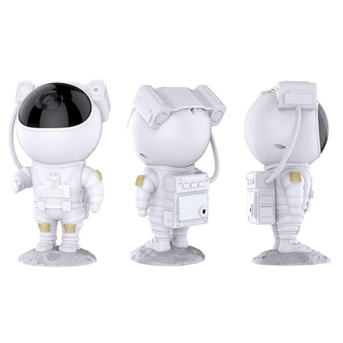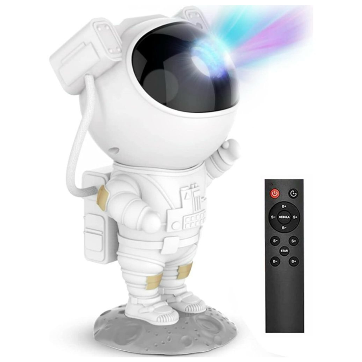 La cabeza del astronauta se puede girar 360 ° a través de la fuerza magnética, permitiendo que la nebulosa gire en cualquier ángulo, cambiando entre múltiples entornos, y fácil de mover y usar. La base lunar es desmontable, el brazo se puede mover 360 °, y puede asumir varias posturas. El mando a distancia puede ajustar los colores, la velocidad y el brillo de la nebulosa y la estrella, así como el interruptor de temporizador(45 minutos o 90 minutos se apagan automáticamente). Dimensiones: 22,8 cm x 12 cm Incluye un proyector de estrellas astronautas, un cable USB, un mando a distancia y un manual de usuario.